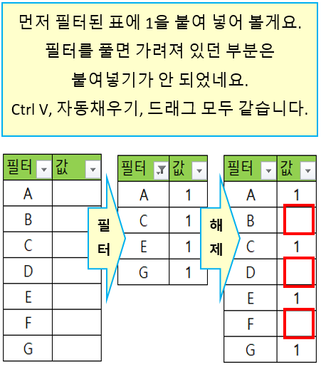 먼저 필터된 표에 1을 붙여 넣어 볼게요.